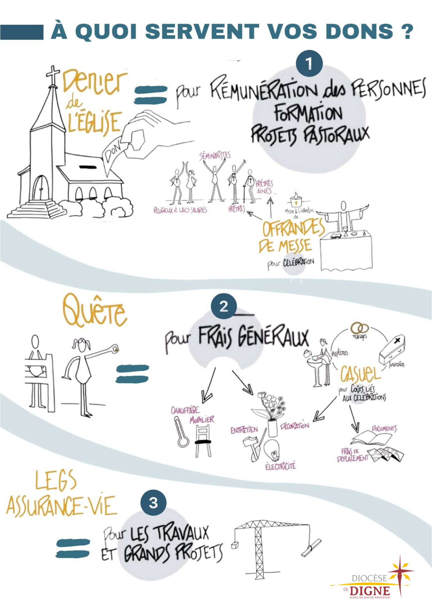 Chaque année, nous venons vers vous pour la collecte du denier de l’Eglise. Cette collecte permet de couvrir 40% des dépenses du diocèse. Elle est affectée entièrement aux traitements des prêtres et à la rémunération des laïcs salariés. Cela représente 56% des dépenses de l’Association diocésaine.