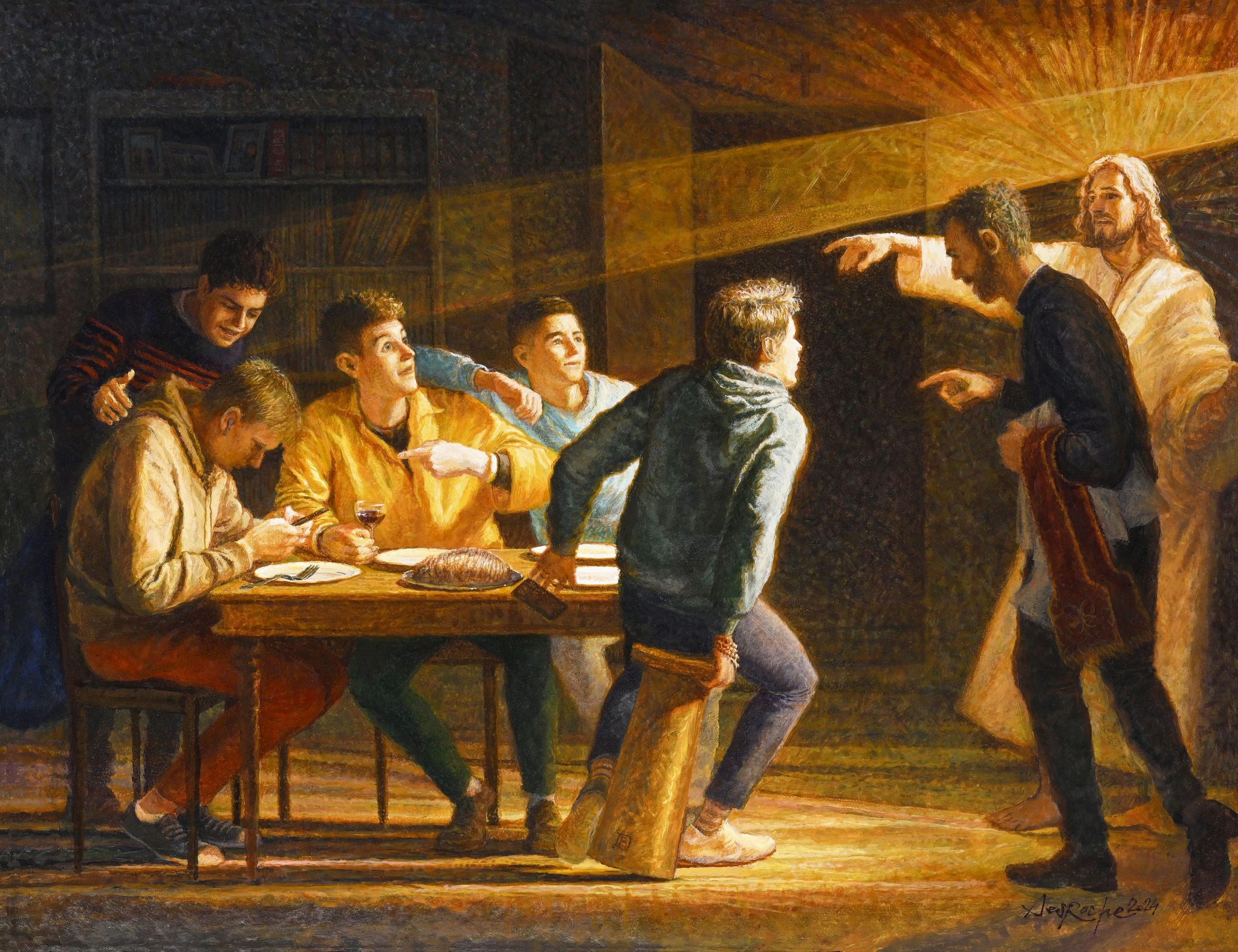 Mais il ne s'agit plus du Matthieu de l'évangile, mais de 4 garçons d'aujourd'hui, que Jésus vient appeler à le suivre. Debout derrière eux, Carlo Acutis "himself" les encourage à lever les yeux de leurs smartphones et à regarder Qui est là. Cette idée est assez géniale et l'abbé à demandé à Desroche que le tableau soit placé dans une valise en bois qui puisse se transporter facilement pour aller parler de vocation dans divers lieux. Il y a quelques jours, place Saint-Pierre, pendant le jubilé des jeunes, le prêtre présentait valise et tableau à Léon XIV, qui a approuvé l'idée et l'œuvre, béni et signé le tableau !